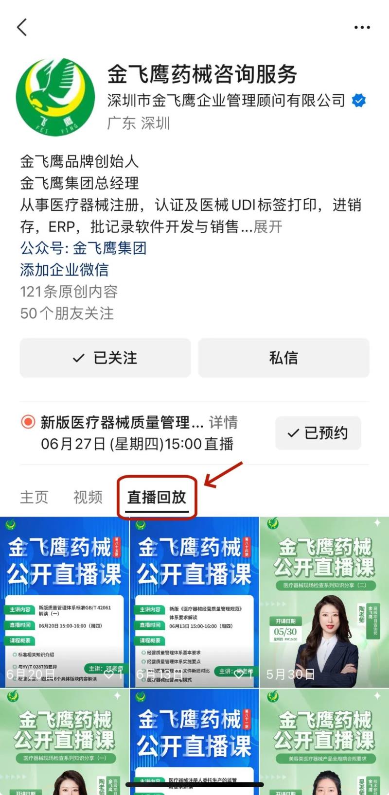往期直播培訓(xùn)課程支持回放,關(guān)注“金飛鷹藥械咨詢(xún)服務(wù)”視頻號(hào)并點(diǎn)擊視頻號(hào)主頁(yè),即可查看“直播回放”哦~