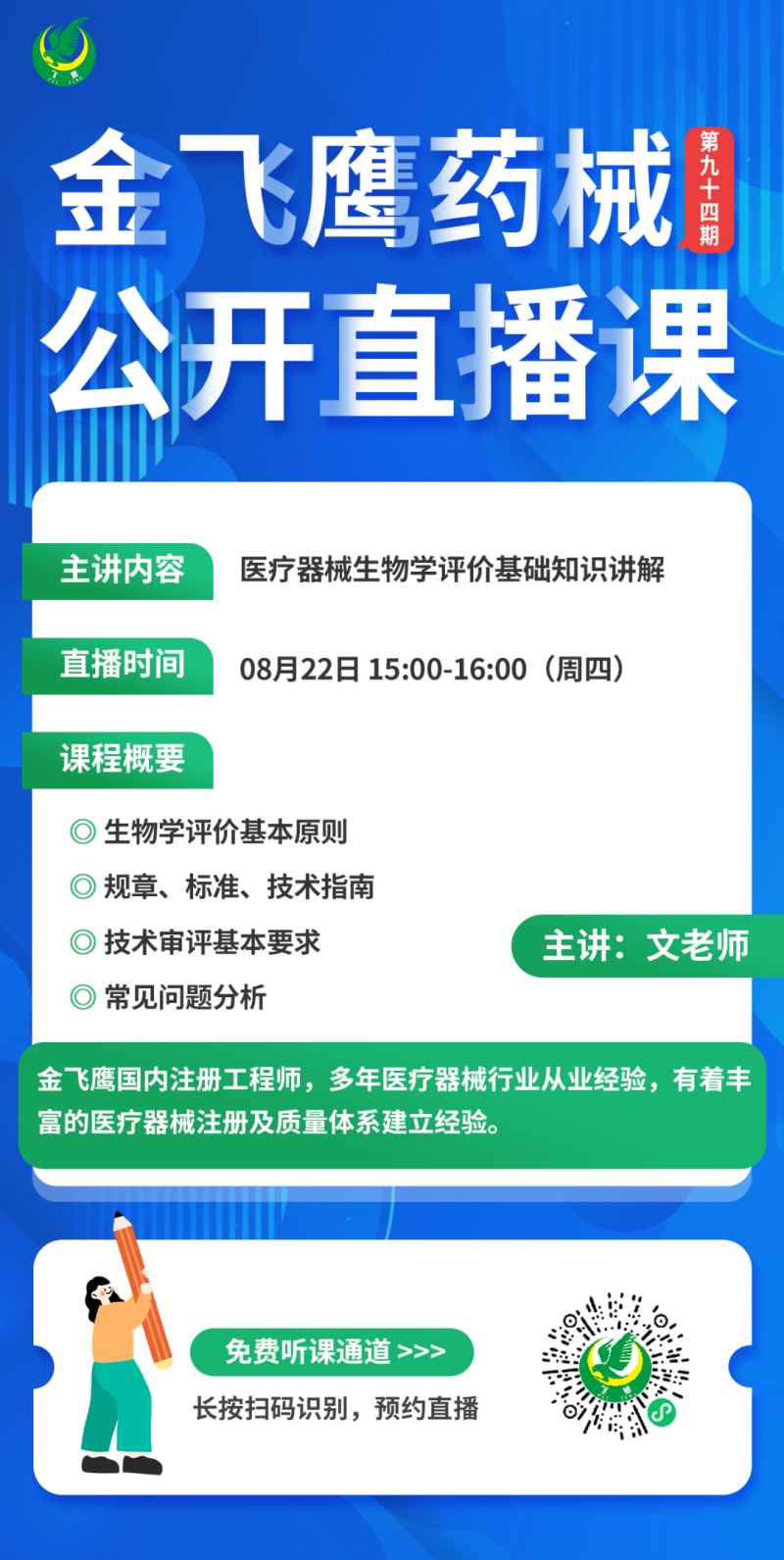 8月22日下午3點(diǎn),金飛鷹國(guó)內(nèi)注冊(cè)工程師,有著豐富的醫(yī)療器械注冊(cè)及質(zhì)量體系建立經(jīng)驗(yàn)的文老師,給大家?guī)?lái)《醫(yī)療器械生物學(xué)評(píng)價(jià)基礎(chǔ)知識(shí)講解》,培訓(xùn)內(nèi)容包括生物學(xué)評(píng)價(jià)基本原則、規(guī)章/標(biāo)準(zhǔn)/技術(shù)指南、技術(shù)審評(píng)基本要求、常見(jiàn)問(wèn)題分析,大家千萬(wàn)不要錯(cuò)過(guò)了!