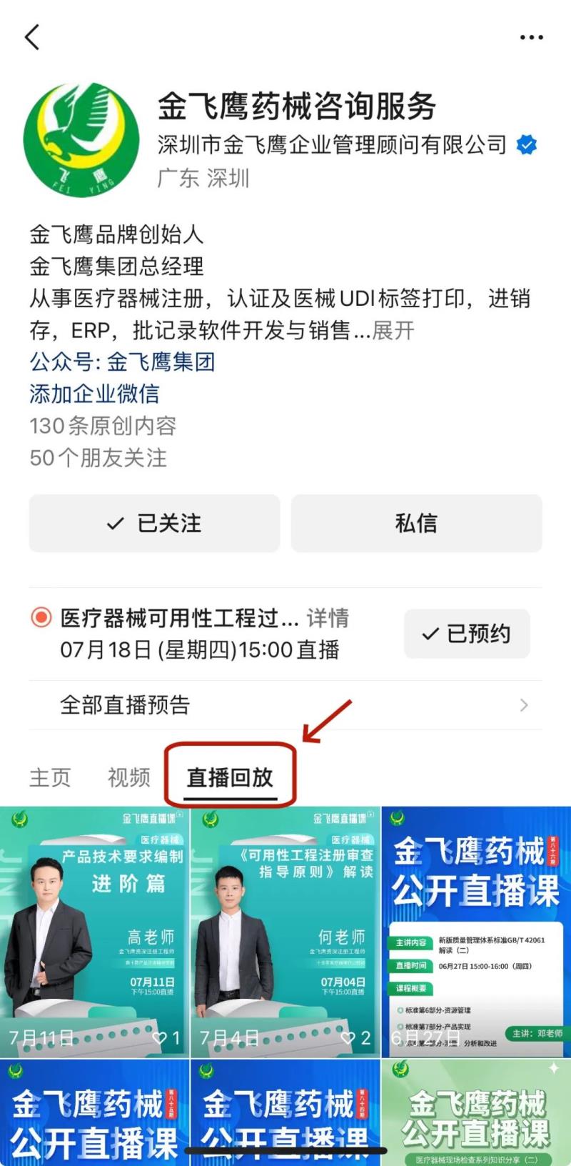 往期直播培訓(xùn)課程支持回放,關(guān)注“金飛鷹藥械咨詢服務(wù)”視頻號并點擊視頻號主頁,即可查看“直播回放”哦~