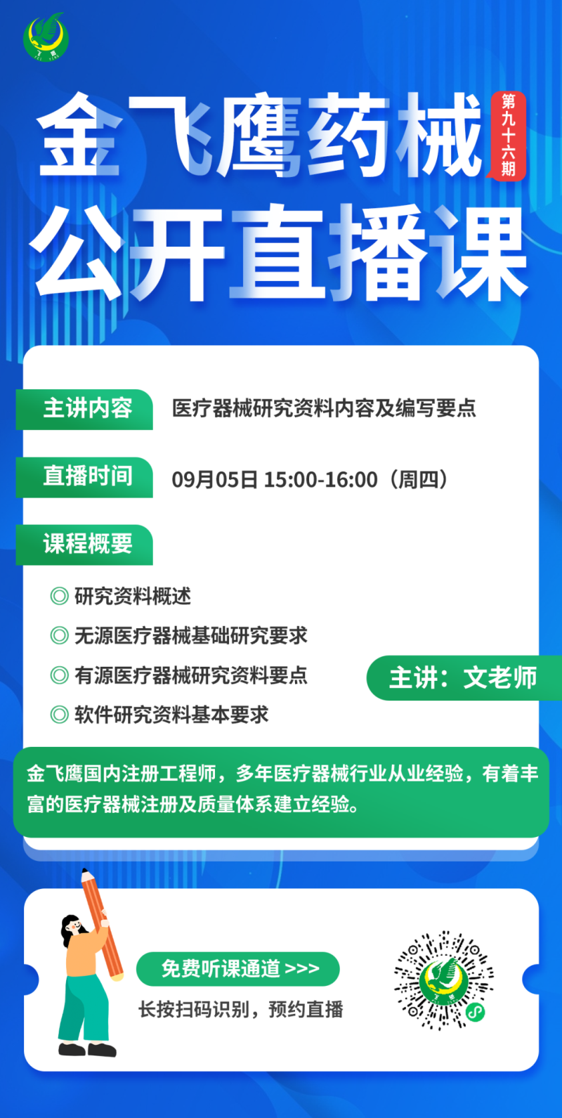 9月5日下午3點,金飛鷹國內(nèi)注冊工程師,有著豐富的醫(yī)療器械注冊及質(zhì)量體系建立經(jīng)驗的文老師,給大家?guī)怼夺t(yī)療器械注冊入門知識分享-研究資料內(nèi)容及編寫要點》,培訓(xùn)內(nèi)容包括研究資料概述、無源醫(yī)療器械基礎(chǔ)研究要求、有源醫(yī)療器械研究資料要點、軟件研究資料基本要求,大家千萬不要錯過了!