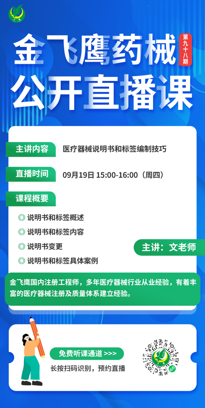 9月19日下午3點,金飛鷹國內注冊工程師,有著豐富的醫(yī)療器械注冊及質量體系建立經驗的文老師,給大家?guī)怼夺t(yī)療器械注冊入門知識分享-產品說明書和標簽編制技巧》,培訓內容包括說明書和標簽概述、說明書和標簽內容、說明書變更、說明書和標簽具體案例,大家千萬不要錯過了!