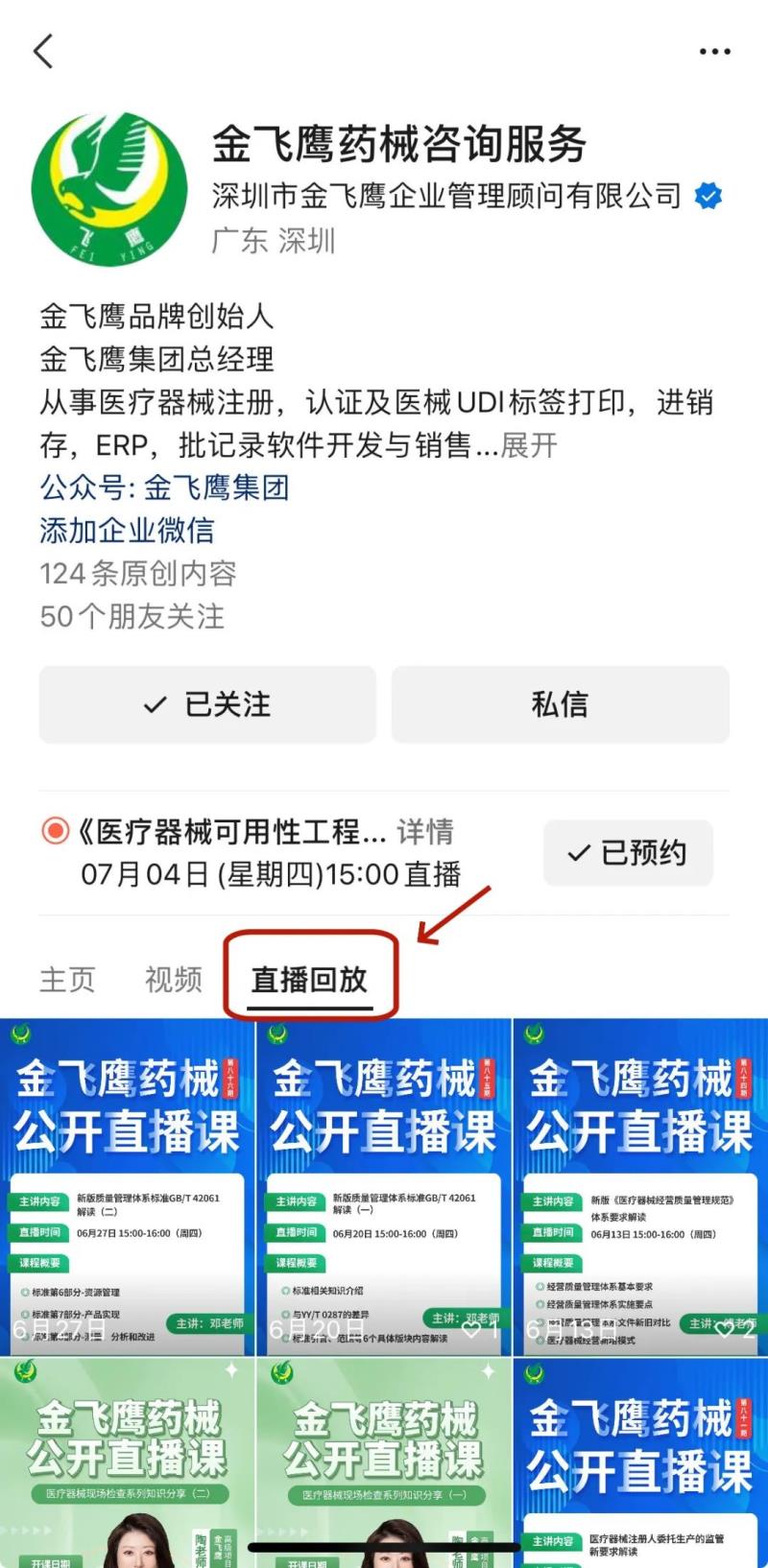 往期直播培訓(xùn)課程支持回放,關(guān)注“金飛鷹藥械咨詢服務(wù)”視頻號并點擊視頻號主頁,即可查看“直播回放”哦~
