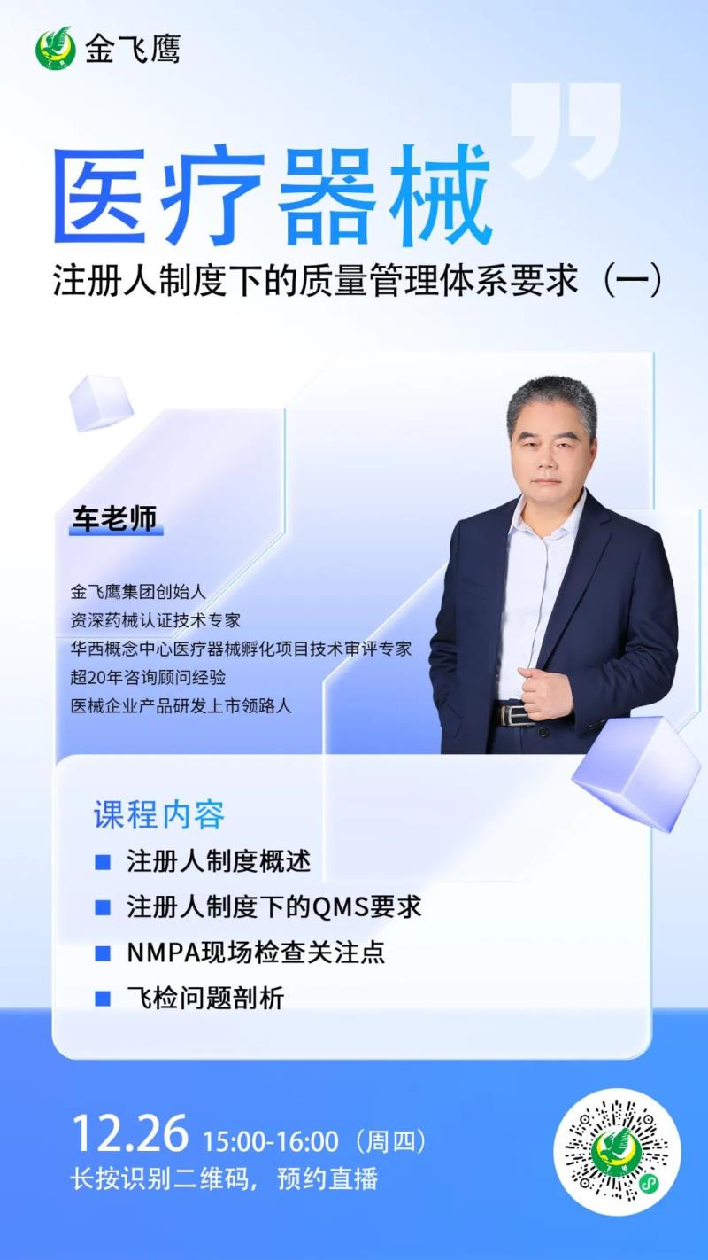 又是咱們金飛鷹集團創(chuàng)始人車號爽老師《醫(yī)療器械監(jiān)督管理條例》第三十四條明確規(guī)定:“醫(yī)療器械注冊人、備案人可以自行生產醫(yī)療器械,也可以委托符合本條例規(guī)定、具備相應條件的企業(yè)生產醫(yī)療器械?!?/span>這里提到的“委托生產”方式就是業(yè)內常說的“注冊人制度”。因為此種方式涉及注冊人及生產商兩家企業(yè),國家對其監(jiān)管也更為嚴格,注冊人在選擇具備相應條件的企業(yè)作為受托方后,需與受托方簽訂《醫(yī)療器械委托生產質量協(xié)議》,以明確各自在醫(yī)療器械生產過程中的責任分工和義務,最終確保醫(yī)械產品的安全有效。但是,通過近年來輔導的諸多委托生產案例我們發(fā)現,很多醫(yī)療器械注冊人對企業(yè)質量管理體系的重視不夠,以為委托出去便“萬事大吉”了,從而導致在現場檢查中體系不符合規(guī)定、委托方對受托方的審核監(jiān)管不到位、雙方職責不明確等問題層出不窮,因此我們策劃了本期課程,結合具體實例,給大家全面剖析醫(yī)療器械注冊人制度下的質量管理體系要求。12月26日下午3點,金飛鷹集團創(chuàng)始人車號爽老師給大家?guī)怼夺t(yī)療器械注冊人制度下的質量管理體系要求》,培訓內容包括注冊人制度概述、注冊人制度下的QMS要求、NMPA現場檢查關注點、飛檢問題剖析,想聽課的朋友記得提前預約!