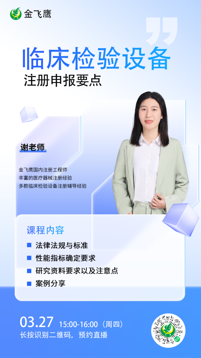 作為一家深耕醫(yī)療器械行業(yè)18年的專(zhuān)業(yè)咨詢(xún)公司,金飛鷹在臨床檢驗(yàn)設(shè)備注冊(cè)方面積累了豐富的實(shí)戰(zhàn)經(jīng)驗(yàn)(如核酸分子雜交儀、微陣列芯片掃描儀、幽門(mén)螺旋桿菌測(cè)試儀等),成功輔導(dǎo)了眾多企業(yè)完成注冊(cè)審批。因此,我們特別推出有關(guān)臨床檢驗(yàn)設(shè)備注冊(cè)的線上直播課,助力相關(guān)企業(yè)更高效地完成產(chǎn)品注冊(cè)申報(bào)。