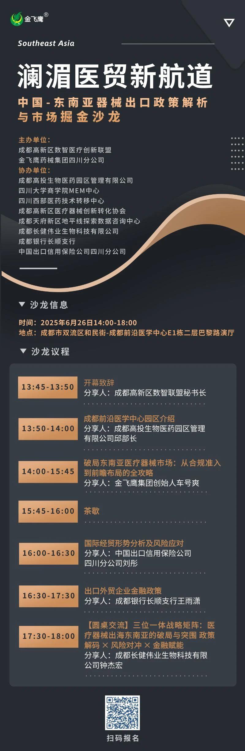 為助力國內(nèi)醫(yī)療器械企業(yè)把握這一黃金機(jī)遇,我們聯(lián)合成都高新區(qū)數(shù)智醫(yī)療創(chuàng)新聯(lián)盟特別策劃了“瀾湄醫(yī)貿(mào)新航道——中國-東南亞器械出口政策解析與市場(chǎng)掘金沙龍”,本次沙龍由成都高新區(qū)數(shù)智醫(yī)療創(chuàng)新聯(lián)盟、金飛鷹藥械集團(tuán)四川分公司主辦,成都高投生物醫(yī)藥園區(qū)管理有限公司、四川大學(xué)商學(xué)院MEM中心、四川西部醫(yī)藥技術(shù)轉(zhuǎn)移中心、成都高新區(qū)醫(yī)療器械創(chuàng)新轉(zhuǎn)化協(xié)會(huì)、成都天府新區(qū)地平線探索數(shù)據(jù)咨詢中心、成都長(zhǎng)健偉業(yè)生物科技有限公司、成都銀行長(zhǎng)順支行、中國出口信用保險(xiǎn)公司四川分公司協(xié)辦,誠邀廣大行業(yè)同仁與我們共同探討這片百億藍(lán)海市場(chǎng)的掘金之道!