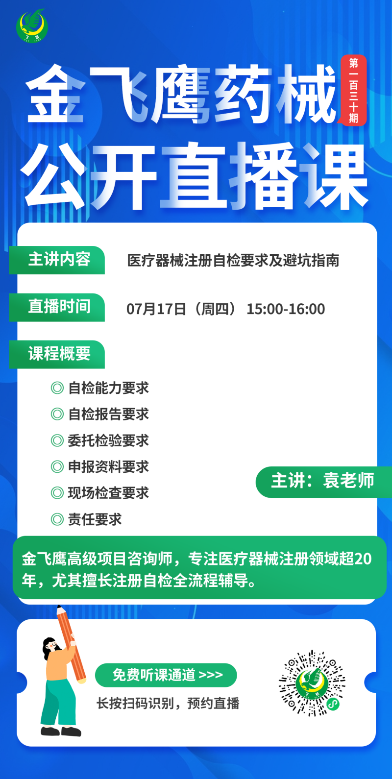 7月17日下午3點(diǎn),金飛鷹高級項(xiàng)目咨詢師,專注醫(yī)療器械注冊領(lǐng)域超20年,尤其擅長注冊自檢全流程輔導(dǎo)的袁老師給大家?guī)怼?/span>醫(yī)療器械注冊自檢要求及避坑指南》,在一一梳理注冊自檢各方面要求的同時,還會結(jié)合過往的實(shí)際輔導(dǎo)案例給大家總結(jié)避坑指南及現(xiàn)場核查應(yīng)對策略,感興趣的朋友記得提前預(yù)約!