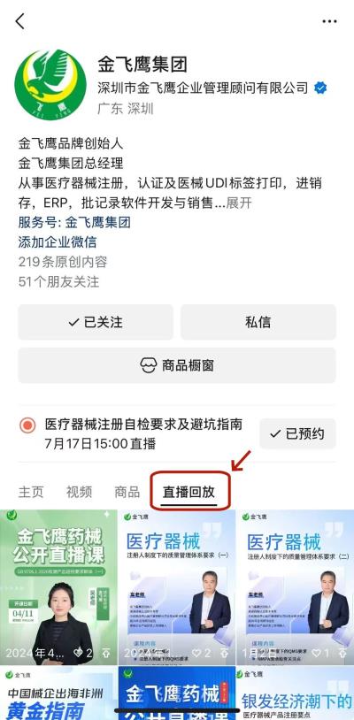 往期直播培訓(xùn)課程支持回放,關(guān)注“金飛鷹藥械咨詢服務(wù)”視頻號并點(diǎn)擊視頻號主頁,即可查看“直播回放”哦~