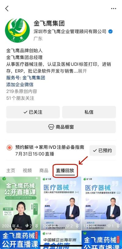 往期直播培訓(xùn)課程支持回放,關(guān)注“金飛鷹藥械咨詢服務(wù)”視頻號并點擊視頻號主頁,即可查看“直播回放”哦~