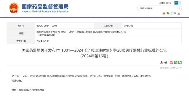 2月19日,國家藥監(jiān)局發(fā)布YY 1001-2024《全玻璃注射器》、YY/T 0853-2024《醫(yī)用靜脈曲張壓力襪》等20項(xiàng)醫(yī)療器械行業(yè)標(biāo)準(zhǔn)(最早自2025年3月1日起實(shí)施),具體如下: