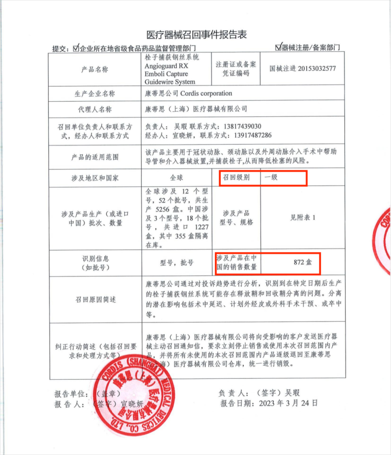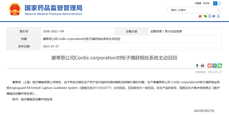 3月27日,國家藥監(jiān)局官網(wǎng)發(fā)布一則醫(yī)療器械召回公告,由于特定日期后生產(chǎn)的產(chǎn)品可能存在釋放鞘和回收鞘分離的問題,生產(chǎn)商康蒂思公司 Cordis corporation對(duì)栓子捕獲鋼絲系統(tǒng)Angioguard RX Emboli Capture Guidewire System(國械注進(jìn)20153032577)主動(dòng)召回。召回級(jí)別為一級(jí)召回,詳情如下: