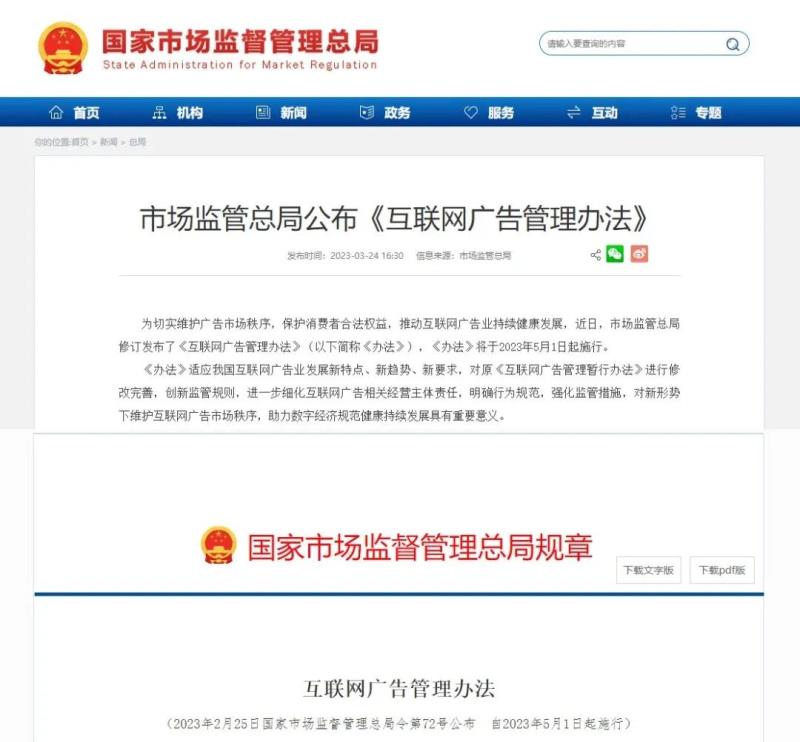 近日,國家市場監(jiān)管總局修訂發(fā)布了《互聯(lián)網(wǎng)廣告管理辦法》(以下簡稱《辦法》),并將于2023年5月1日起正式施行,此前2016年發(fā)布的《互聯(lián)網(wǎng)廣告管理暫行辦法》將同時廢止。