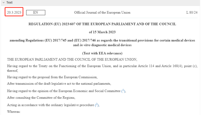 最后,該法案于 2023 年 3 月 15 日由聯(lián)合立法者簽署,并于2023年3月20日在官方公報(bào)(OJEU)上公布。自此,有關(guān)MDR過(guò)渡期的法案正式“生效”。