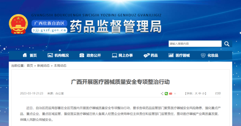 據(jù)廣西壯族自治區(qū)藥監(jiān)局官網(wǎng)消息,近日,該局部署在全區(qū)范圍內(nèi)開(kāi)展醫(yī)療器械質(zhì)量安全專項(xiàng)整治行動(dòng),要求各級(jí)藥品監(jiān)管部門聚焦醫(yī)療器械安全風(fēng)險(xiǎn)隱患、強(qiáng)化重點(diǎn)產(chǎn)品、重點(diǎn)企業(yè)、重點(diǎn)區(qū)域監(jiān)管,督促落實(shí)醫(yī)療器械注冊(cè)人備案人經(jīng)營(yíng)企業(yè)使用單位主體責(zé)任和監(jiān)管部門監(jiān)管責(zé)任,推動(dòng)醫(yī)療器械產(chǎn)業(yè)高質(zhì)量發(fā)展,保障人民群眾用械安全。