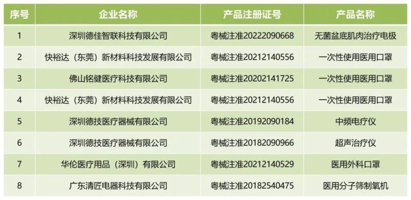 近日,廣東省藥監(jiān)局官網(wǎng)發(fā)布通告稱,按照《醫(yī)療器械注冊管理辦法》的規(guī)定,根據(jù)企業(yè)申請,廣東省藥品監(jiān)督管理局已依法注銷“粵械注準(zhǔn)20222090668”等8個(gè)醫(yī)療器械注冊證,其中包括超聲治療儀、無菌盆底肌肉治療電極、一次性使用醫(yī)用口罩等產(chǎn)品,具體明細(xì)如下: