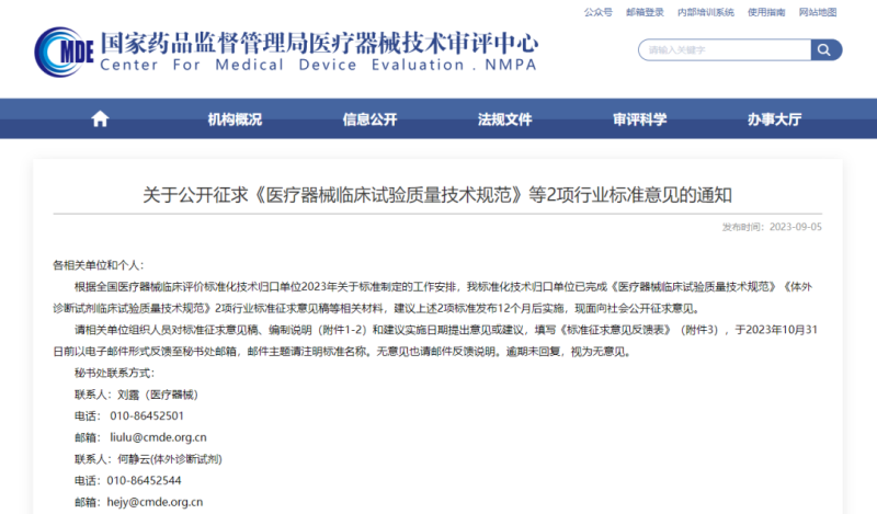 9月5日,國家藥監(jiān)局器審中心發(fā)布《醫(yī)療器械臨床試驗質量技術規(guī)范》《體外診斷試劑臨床試驗質量技術規(guī)范》共2項行業(yè)標準征求意見稿,并向社會公開征求意見。