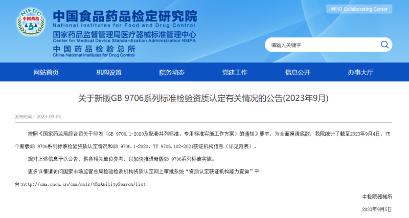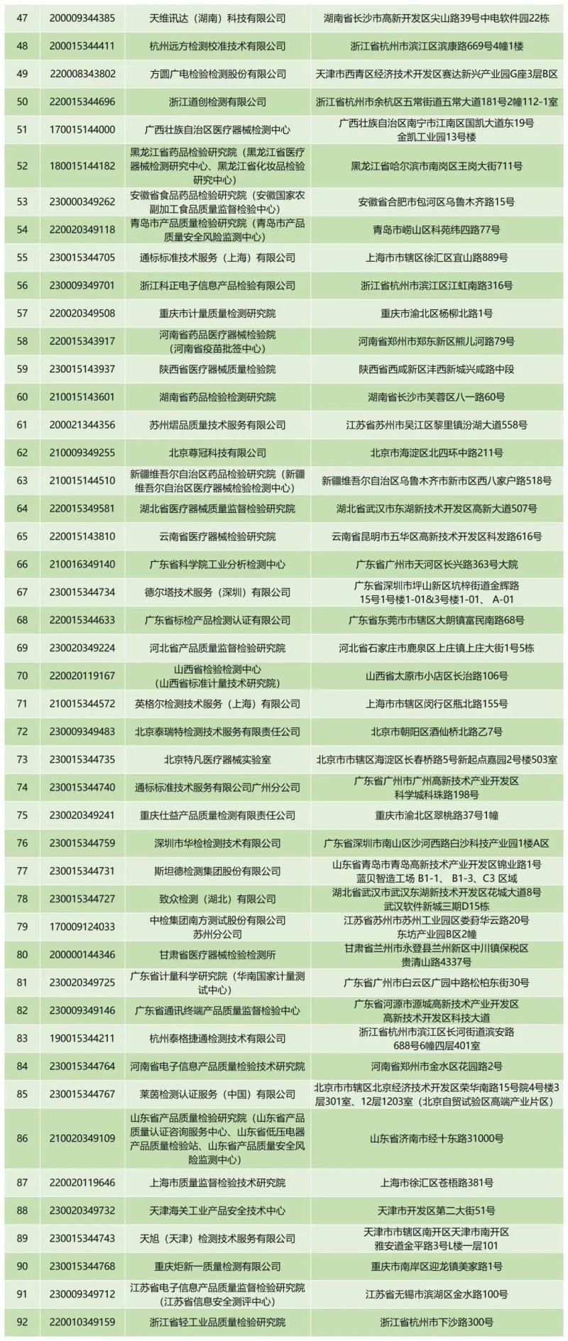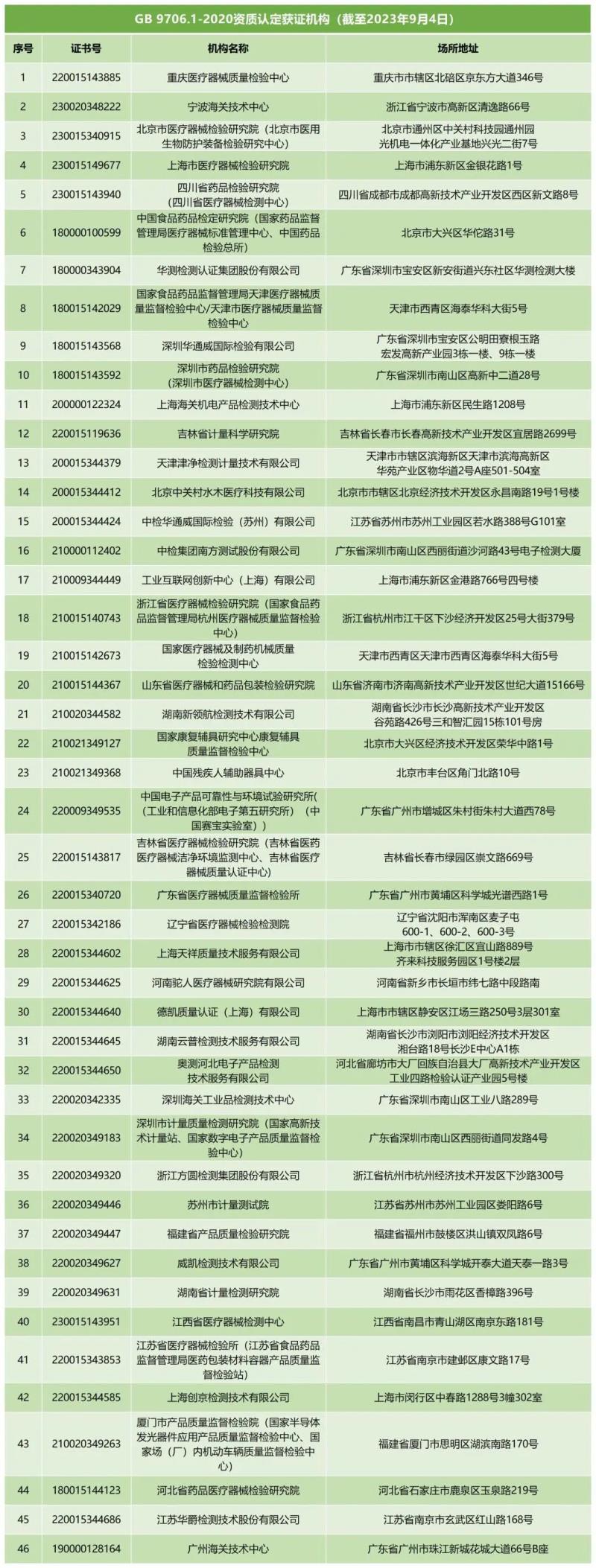 9月5日,中檢院官網(wǎng)公布了截至2023年9月4日,75個(gè)新版GB 9706系列標(biāo)準(zhǔn)檢驗(yàn)資質(zhì)認(rèn)定情況和GB 9706.1-2020、YY 9706.102-2021獲證機(jī)構(gòu)信息。我們從附件表格中可以看到,全國(guó)共有92家GB 9706.1-2020資質(zhì)認(rèn)定獲證機(jī)構(gòu),也就是說(shuō),可以承擔(dān)新標(biāo)的安規(guī)檢測(cè)工作,具體如下: