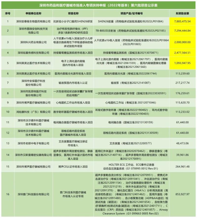 近日,深圳市發(fā)展和改革委員會官網(wǎng)發(fā)布《深圳市藥品和醫(yī)療器械市場準入專項扶持申報(2022年版本)第六批擬資助項目的公示》,包括深圳市貝斯曼精密儀器有限公司的超聲多普勒外周血管檢測儀/靜脈顯像儀/醫(yī)用紅外體溫計國內市場準入項目、深圳市沃爾德外科醫(yī)療器械技術有限公司的椎間融合器/頸椎后路內固定系統(tǒng)醫(yī)療器械市場準入項目、深圳市老郎中電子有限公司的艾灸裝置醫(yī)療器械注冊證市場準入等在內的共計16個項目,其中擬資助金額最高為788萬余元,而100萬元以上的共有5個項目(已用黃色標注),具體明細如下:
