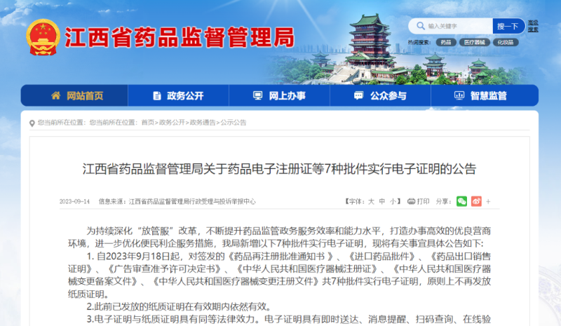 1. 自2023年9月18日起,對簽發(fā)的《藥品再注冊批準通知書 》、《進口藥品批件》、《藥品出口銷售證明》、《廣告審查準予許可決定書》、《中華人民共和國醫(yī)療器械注冊證》、《中華人民共和國醫(yī)療器械變更備案文件》、《中華人民共和國醫(yī)療器械變更注冊文件》共7種批件實行電子證明,原則上不再發(fā)放紙質證明。