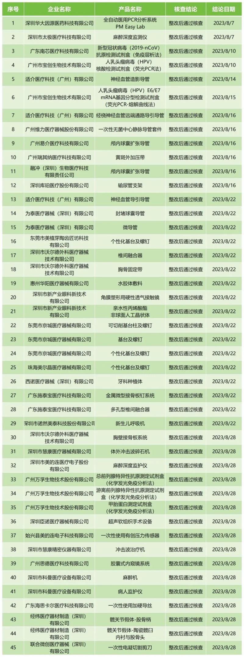 9月18日,廣東省藥監(jiān)局官網公布2023年8月醫(yī)療器械注冊質量管理體系核查結果,包括深圳市沃爾德外科醫(yī)療器械技術有限公司、廣州萬孚生物技術股份有限公司、深圳市科曼醫(yī)療設備有限公司在內的32家公司共計45款產品,均為“整改后通過核查”。具體明細見下方表格: