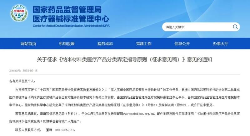 近日,國家藥監(jiān)局醫(yī)療器械標(biāo)準(zhǔn)管理中心官網(wǎng)發(fā)布《納米材料醫(yī)療產(chǎn)品分類界定指導(dǎo)原則(征求意見稿)》,具體內(nèi)容如下: