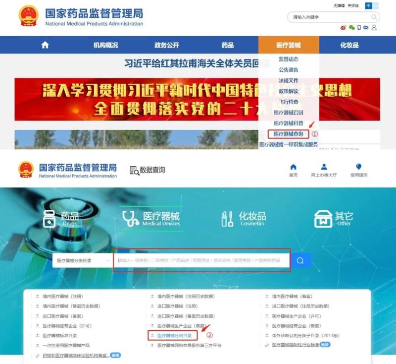 進(jìn)入國家藥監(jiān)局(https://www.nmpa.gov.cn/)網(wǎng)站,在首頁菜單中選擇“醫(yī)療器械”欄,并于下拉菜單中點(diǎn)擊“醫(yī)療器械查詢”,進(jìn)入頁面后點(diǎn)擊“醫(yī)療器械分類目錄”,即可按產(chǎn)品名稱、產(chǎn)品描述或預(yù)期用途等對產(chǎn)品類別進(jìn)行查詢。