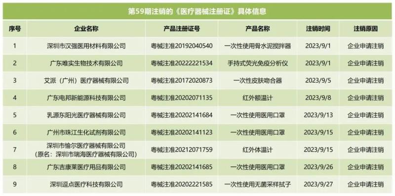 10月7日,廣東省藥監(jiān)局官網(wǎng)發(fā)布通告稱,該局已依法注銷“粵械注準20192040540”等9個醫(yī)療器械注冊證,包括廣東唯實生物技術有限公司的手持式熒光免疫分析儀、廣東電邦新能源科技有限公司的紅外額溫計、廣東吉康萊醫(yī)療用品有限公司的一次性使用醫(yī)用口罩等產(chǎn)品,具體明細如下:排版整理:金飛鷹藥械