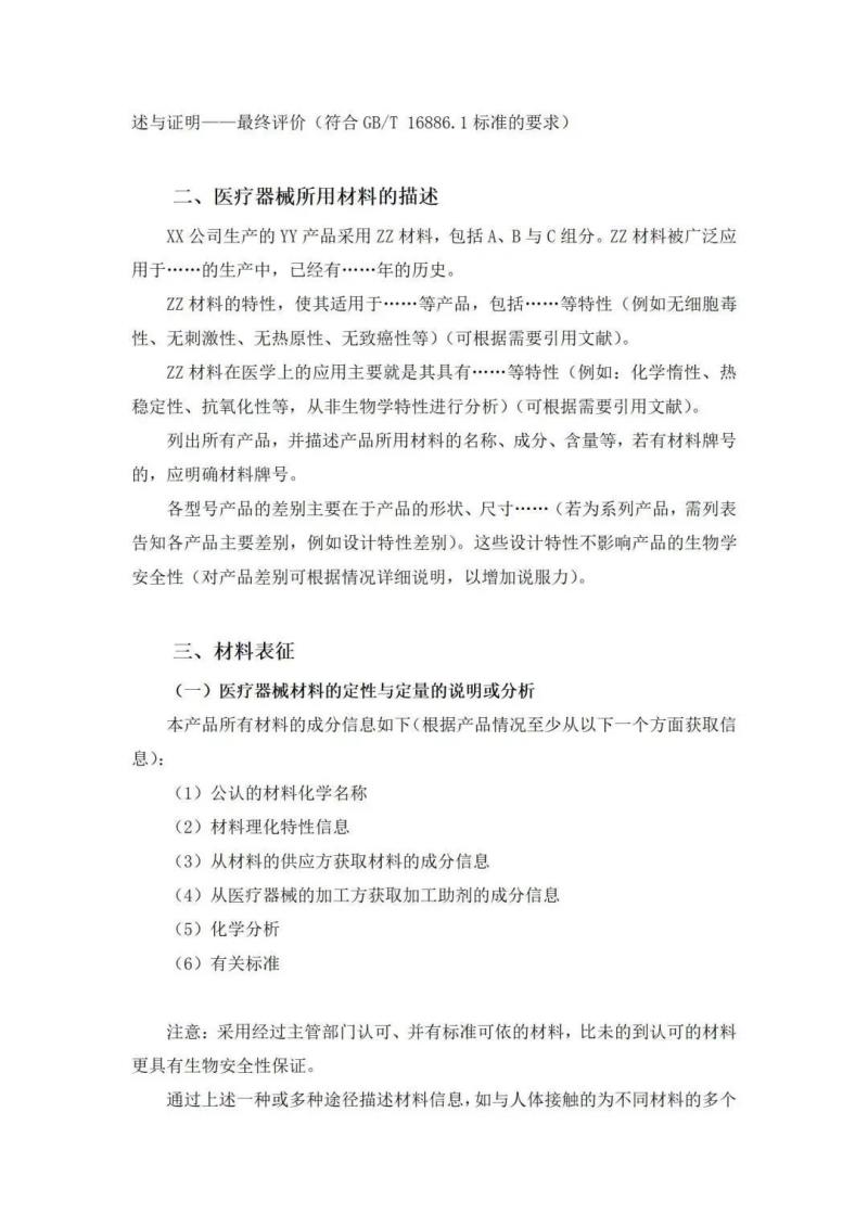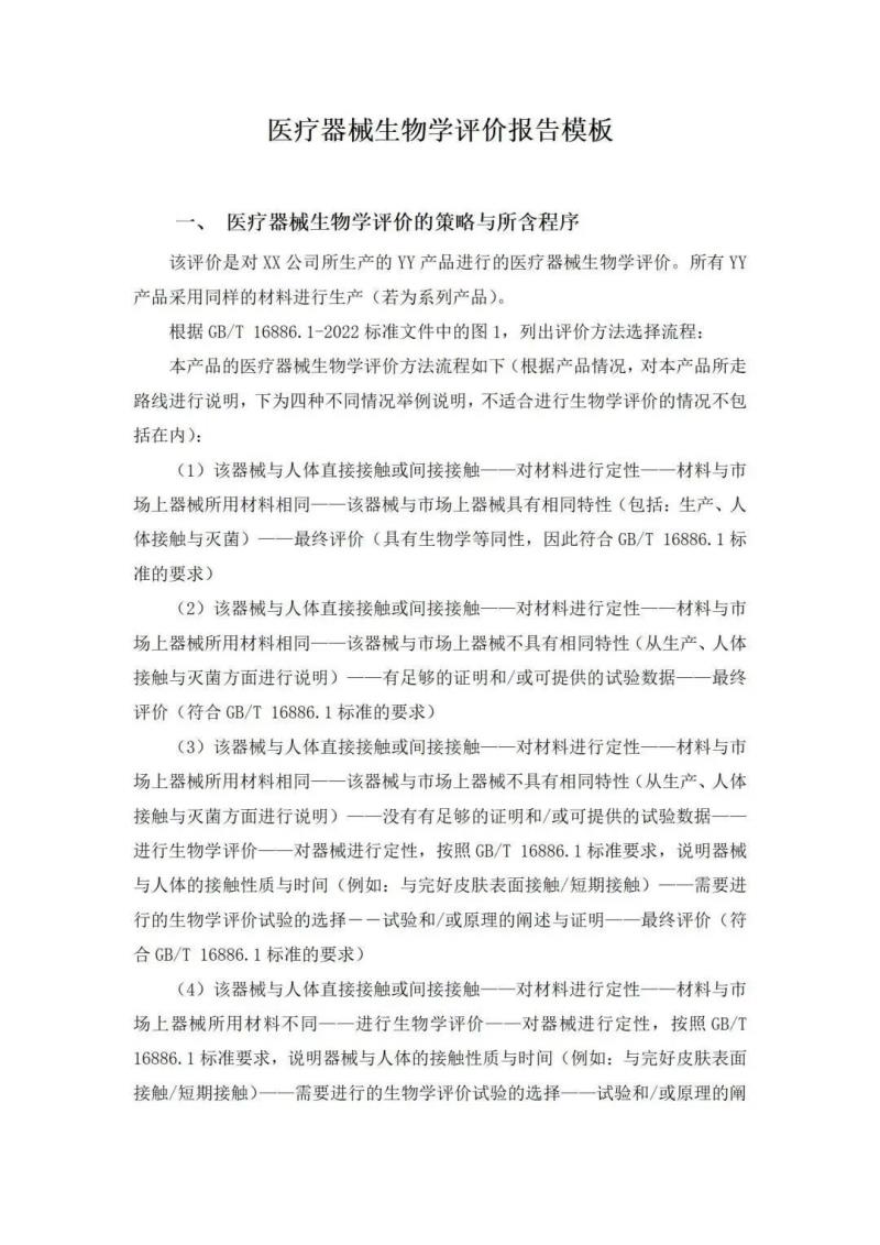 撰寫生物學評價報告時,可從醫(yī)療器械生物學評價的策略與所含程序、醫(yī)療器械所用材料的描述、材料表征、選擇或放棄生物學試驗的理由與論證、已有數(shù)據(jù)與試驗結果的匯總、完成生物學評價所需的其他數(shù)據(jù)、總結七個方面分別進行闡述,我們將報告模板部分內容展示如下: