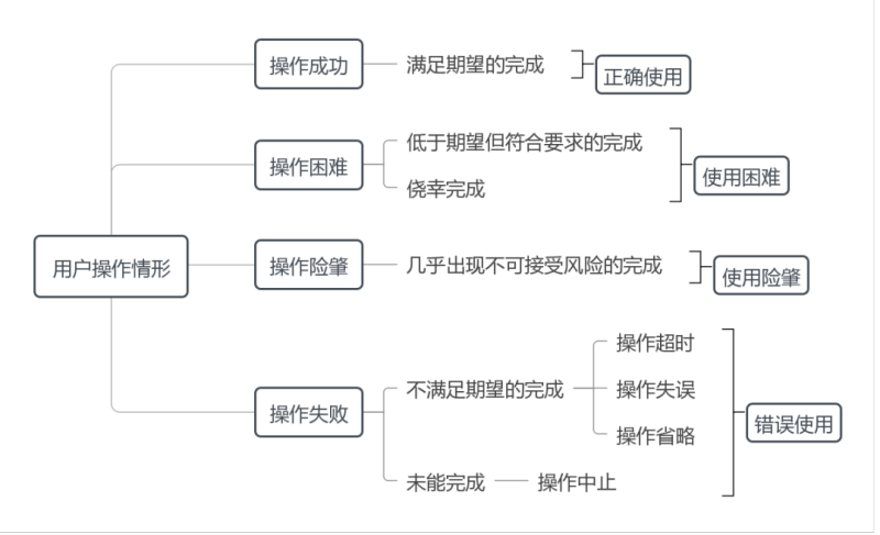 使用錯誤是指可能導(dǎo)致錯誤使用的潛在根源,可分為感知錯誤、認知錯誤和行動錯誤。其中,感知錯誤是指用戶對視覺、聽覺、觸覺等信息感知失效所致的使用錯誤,如看錯輸出結(jié)果單位、未聽到報警聲音等;認知錯誤是指用戶對知識、規(guī)則、信息存在記憶、理解等認知失效所致的使用錯誤,如漏記手術(shù)操作步驟、誤解符號含義等;行動錯誤是指用戶操作失誤、不當?shù)刃袆邮碌氖褂缅e誤,如按錯控制按鈕、按壓力度不夠而未激活等。