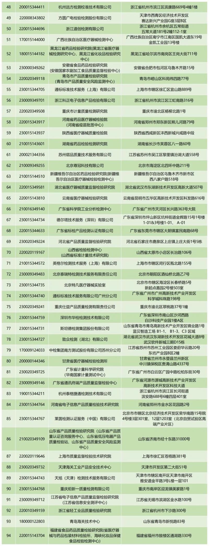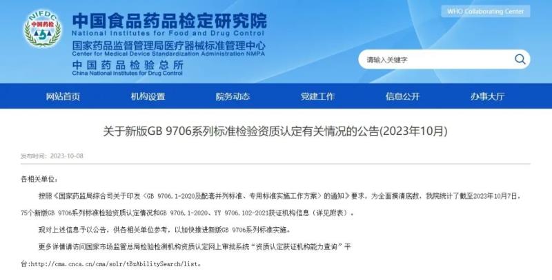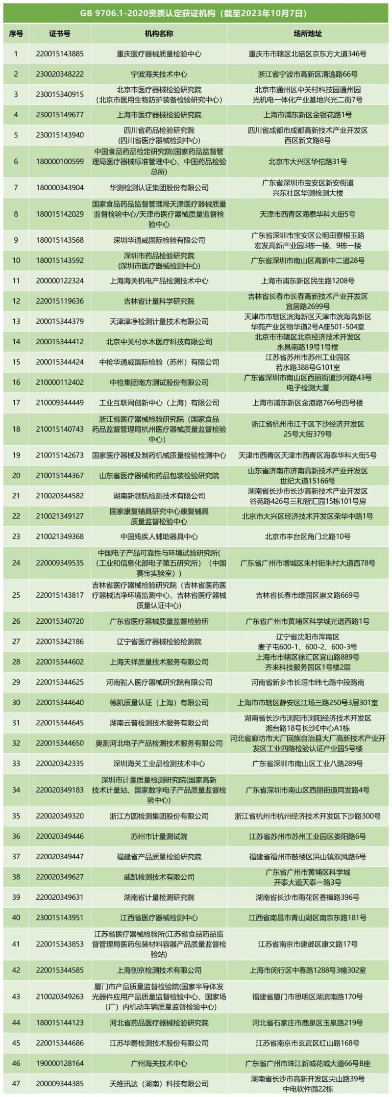 近日,中檢院官網(wǎng)公布了截至2023年10月7日,75個新版GB 9706系列標(biāo)準(zhǔn)檢驗資質(zhì)認(rèn)定情況和GB 9706.1-2020、YY 9706.102-2021獲證機構(gòu)信息。我們從附件表格中可以看到,全國共有94家(比9月新增2家)GB 9706.1-2020資質(zhì)認(rèn)定獲證機構(gòu),也就是說,可以承擔(dān)新標(biāo)的安規(guī)檢測工作,具體如下: