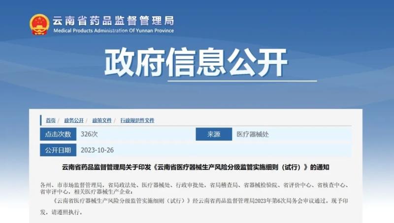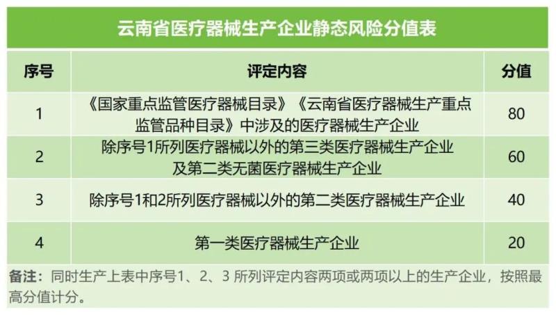 10月26日,云南省藥監(jiān)局官網(wǎng)發(fā)布《云南省醫(yī)療器械生產(chǎn)風(fēng)險分級監(jiān)管實施細(xì)則(試行)》(以下簡稱《實施細(xì)則》),其中指出設(shè)定醫(yī)療器械生產(chǎn)企業(yè)靜態(tài)風(fēng)險和動態(tài)風(fēng)險評價指標(biāo)及分值,根據(jù)計分結(jié)果確定醫(yī)療器械生產(chǎn)企業(yè)風(fēng)險等級。