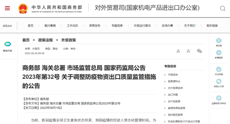 近日,國(guó)家商務(wù)部官網(wǎng)發(fā)布《關(guān)于調(diào)整防疫物資出口質(zhì)量監(jiān)管措施的公告》,就非醫(yī)用口罩、新型冠狀病毒檢測(cè)試劑、醫(yī)用口罩、醫(yī)用防護(hù)服、呼吸機(jī)、紅外體溫計(jì)六大類防疫物資產(chǎn)品出口質(zhì)量監(jiān)管措施作出如下調(diào)整: