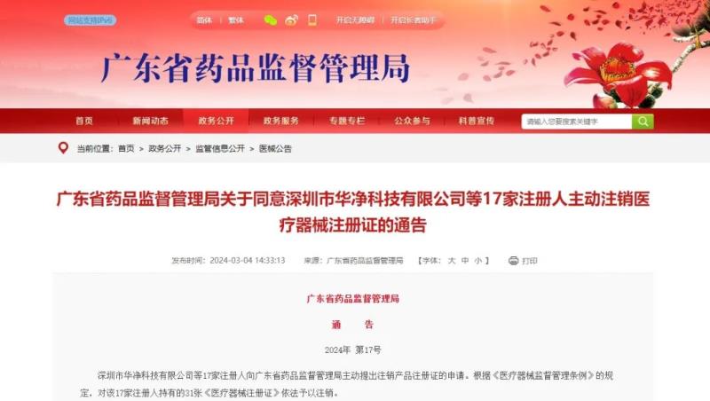 3月4日,廣東藥監(jiān)局發(fā)布通告稱,深圳市華凈科技有限公司等17家注冊人向廣東省藥品監(jiān)督管理局主動提出注銷產(chǎn)品注冊證的申請,注銷產(chǎn)品以醫(yī)用口罩居多,還有紅外體溫計、額溫計、電子血壓計等。根據(jù)《醫(yī)療器械監(jiān)督管理條例》的規(guī)定,該局對該17家注冊人持有的31張《醫(yī)療器械注冊證》依法予以注銷。具體注銷清單如下: