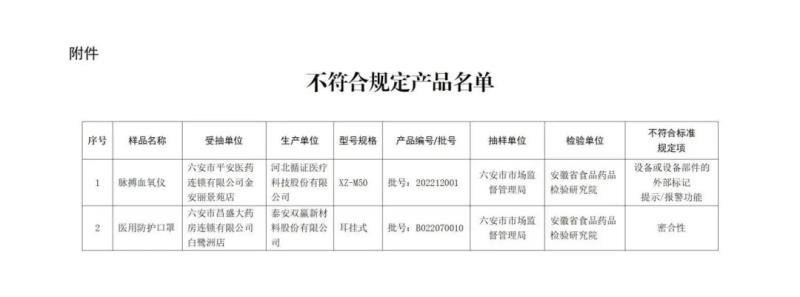 (一)脈搏血氧儀1批:標(biāo)示為河北循證醫(yī)療科技股份有限公司生產(chǎn),設(shè)備或設(shè)備部件的外部標(biāo)記 提示/報警功能不符合標(biāo)準(zhǔn)規(guī)定。 (二)醫(yī)用防護(hù)口罩1批:標(biāo)示為泰安雙贏新材料股份有限公司生產(chǎn),密合性不符合標(biāo)準(zhǔn)規(guī)定。