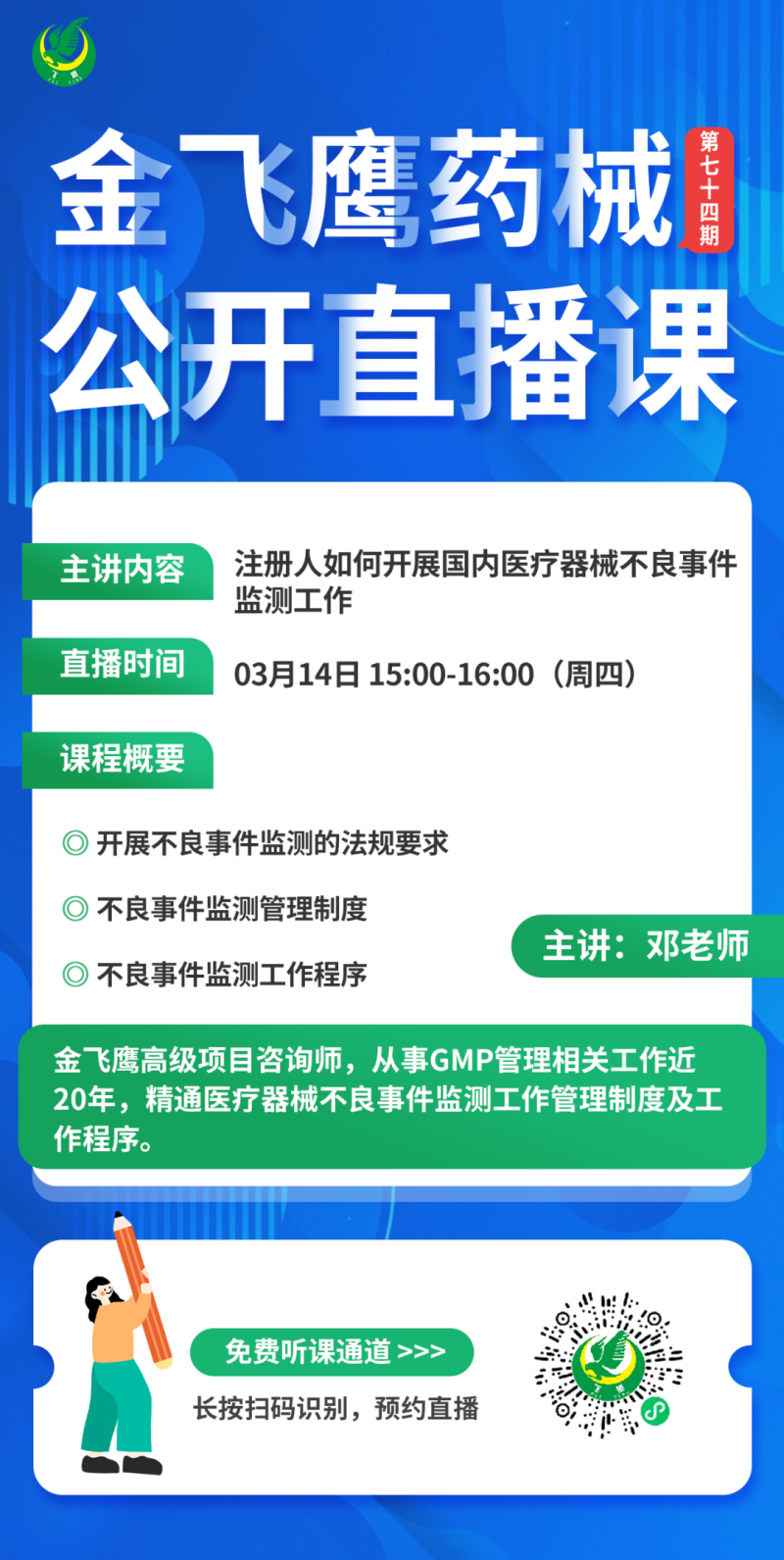 3月14日下午3點(diǎn),金飛鷹高級項目咨詢師,從事GMP管理相關(guān)工作近20年,精通醫(yī)療器械不良事件監(jiān)測工作管理制度及工作程序的鄧?yán)蠋煟?/span>給大家?guī)怼蹲匀巳绾伍_展國內(nèi)醫(yī)療器械不良事件監(jiān)測工作》,培訓(xùn)內(nèi)容包括醫(yī)療器械不良事件監(jiān)測管理制度、工作程序等,感興趣的企業(yè)千萬不要錯過了哦!
