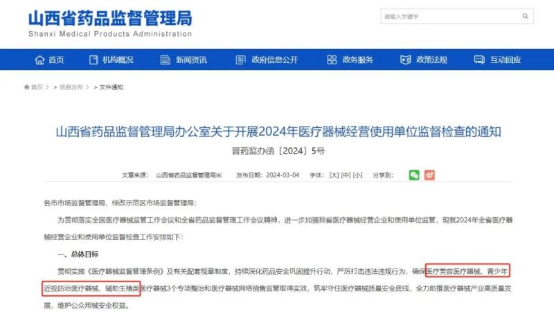 2024年醫(yī)械大檢查在各地逐步推進,3月4日,山西省藥監(jiān)局發(fā)布《關于開展2024年醫(yī)療器械經(jīng)營使用單位監(jiān)督檢查的通知》,醫(yī)療美容、輔助生殖、青少年近視防治、無菌和植入等領域的相關醫(yī)療器械為檢查的重點品種。