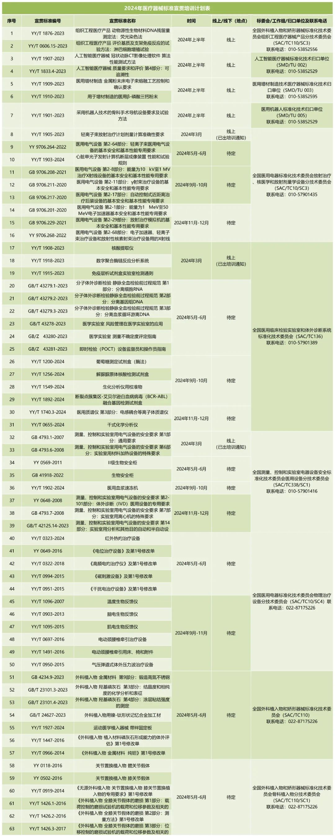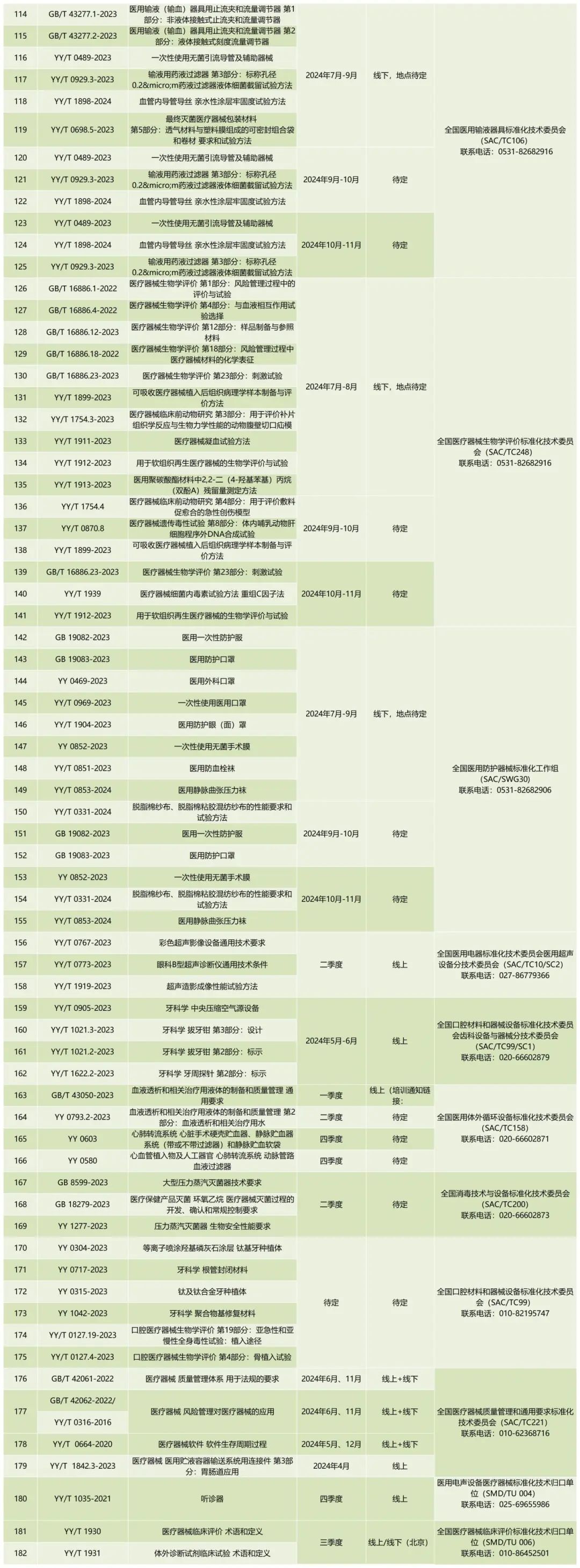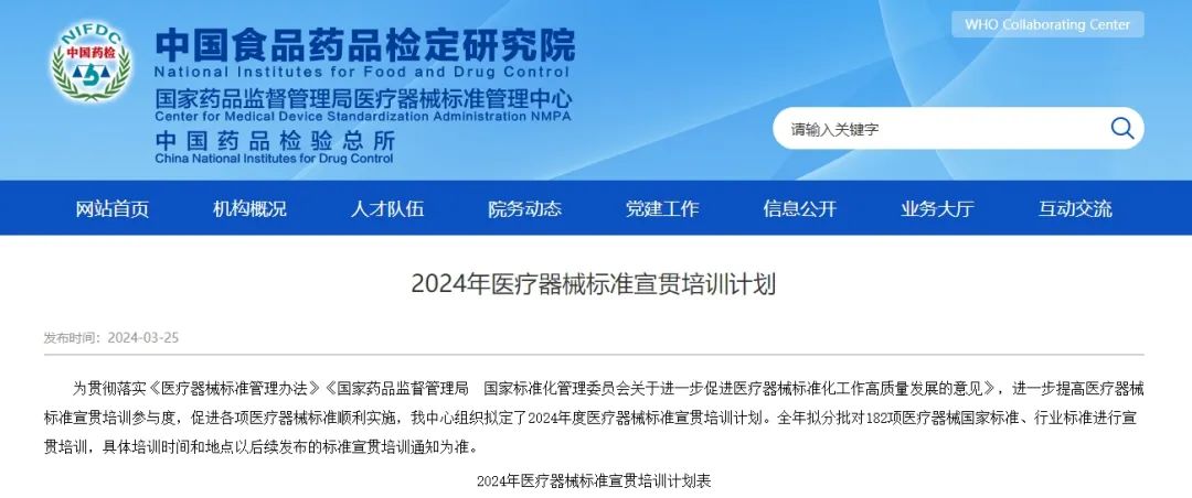 3月25日,國家藥監(jiān)局醫(yī)療器械標(biāo)準(zhǔn)管理中心發(fā)布《2024年醫(yī)療器械標(biāo)準(zhǔn)宣貫培訓(xùn)計劃》,擬分批對182項醫(yī)療器械國家標(biāo)準(zhǔn)、行業(yè)標(biāo)準(zhǔn)進行宣貫培訓(xùn),具體安排如下: