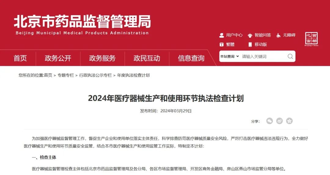 近日,北京市藥監(jiān)局發(fā)布《2024年醫(yī)療器械生產(chǎn)和使用環(huán)節(jié)執(zhí)法檢查計(jì)劃》,其中提到,截至2023年12月31日,全市共有醫(yī)療器械生產(chǎn)企業(yè)1000家,醫(yī)療器械使用單位11219家。依據(jù)《醫(yī)療器械生產(chǎn)監(jiān)督管理辦法》和《醫(yī)療器械使用質(zhì)量監(jiān)督管理辦法》要求,各級監(jiān)管部門要按照計(jì)劃要求,嚴(yán)格落實(shí)監(jiān)管任務(wù)。具體如下: