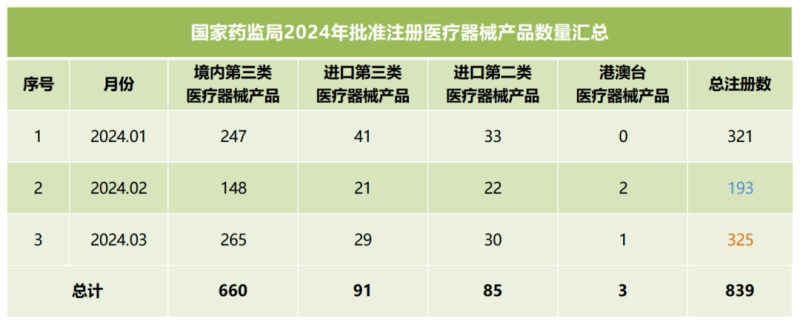 我們同步匯總了2024年第一季度國(guó)家藥監(jiān)局批準(zhǔn)注冊(cè)的醫(yī)療器械產(chǎn)品數(shù)量(見(jiàn)下方表格),從表格中可以看出,截至3月,2024年國(guó)家藥監(jiān)局總計(jì)批準(zhǔn)注冊(cè)醫(yī)療器械產(chǎn)品839個(gè),其中境內(nèi)第三類醫(yī)療器械產(chǎn)品660個(gè),進(jìn)口第三類醫(yī)療器械產(chǎn)品91個(gè),進(jìn)口第二類醫(yī)療器械產(chǎn)品85個(gè),港澳臺(tái)醫(yī)療器械產(chǎn)品3個(gè)。