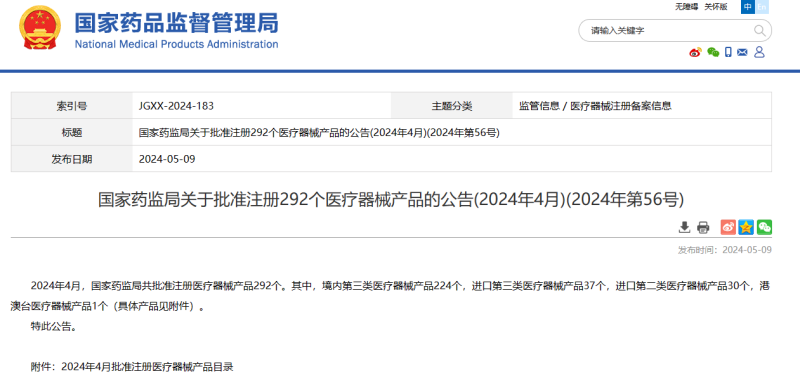 國家藥監(jiān)局發(fā)布,2024年4月共批準292個醫(yī)療器械。1月-4月以來國家藥監(jiān)局共批準注冊了1131個醫(yī)療器械產品。