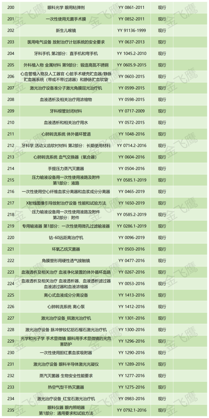 本期文章我們將中檢院官網公布的醫(yī)療器械強制性行業(yè)標準(即以YY作為編號開頭的標準)匯總到一起,共計有235項標準(包括192項現行標準及43項即將實施的標準),部分展示如下: