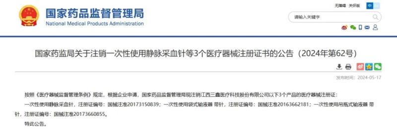 近日,國家藥監(jiān)局發(fā)布一則醫(yī)療器械注冊證注銷公告,公告顯示,該局已依法注銷江西三鑫醫(yī)療科技股份有限公司3個產(chǎn)品的醫(yī)療器械注冊證,具體如下: