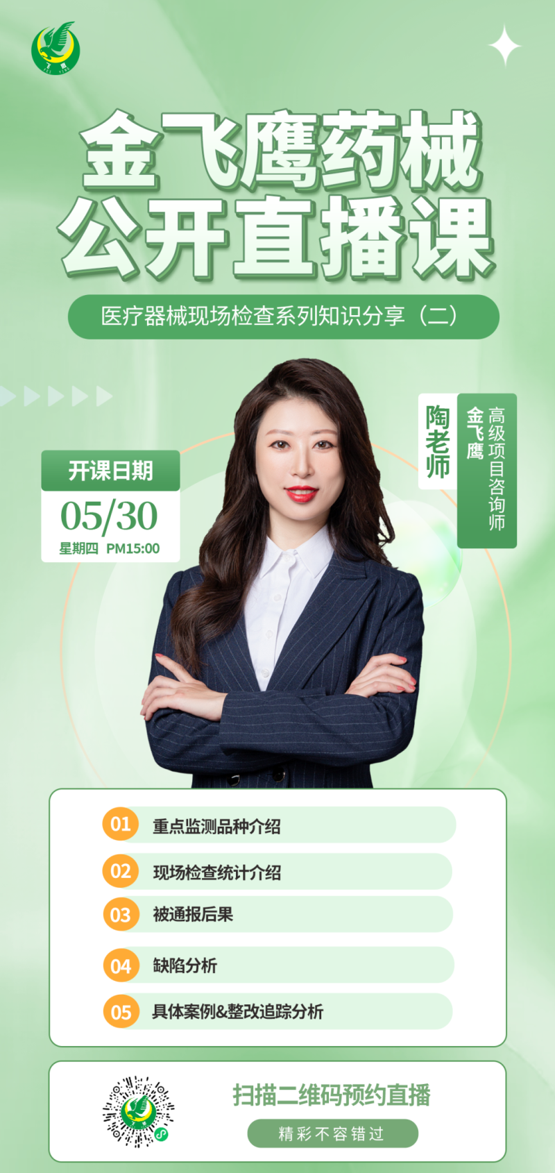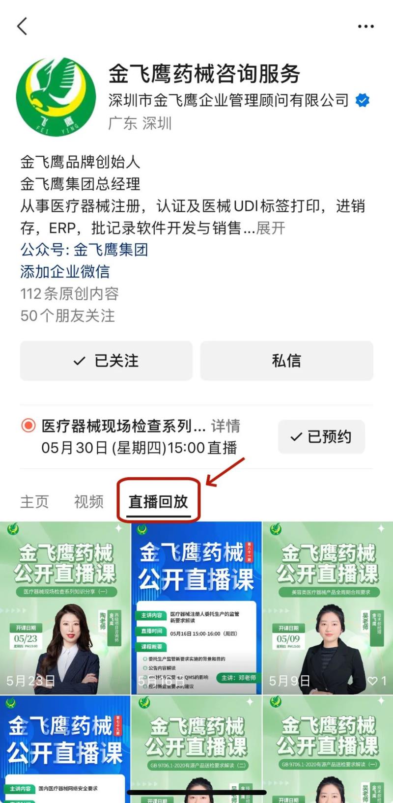 往期直播培訓課程支持回放,關(guān)注“金飛鷹藥械咨詢服務”視頻號并點擊視頻號主頁,即可查看“直播回放”哦~
