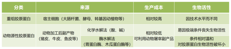 按照來(lái)源的不同膠原蛋白可分為重組膠原蛋白和動(dòng)物源性膠原蛋白。重組膠原蛋白為非天然膠原蛋白,由基因工程技術(shù)合成,而動(dòng)物源性膠原蛋白則從動(dòng)物組織中提取。動(dòng)物源性膠原蛋白生產(chǎn)成本較低且生產(chǎn)工藝相對(duì)簡(jiǎn)單。而重組膠原蛋白擁有更高的生物活性與生物相容性、更低的免疫原性、更低的漏檢病原體隱患風(fēng)險(xiǎn)、更好的水溶性、無(wú)細(xì)胞毒性以及可進(jìn)一步加工優(yōu)化等特點(diǎn),因此其應(yīng)用范圍更加廣泛,受到市場(chǎng)的強(qiáng)烈關(guān)注。
