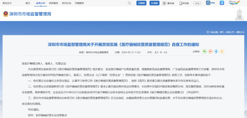 一、各經(jīng)營企業(yè)應(yīng)強(qiáng)化主體責(zé)任落實(shí),認(rèn)真學(xué)習(xí)新修訂的《規(guī)范》,按照《規(guī)范》要求建立健全質(zhì)量管理體系并保證其有效運(yùn)行。 二、各經(jīng)營企業(yè)應(yīng)根據(jù)新修訂的《規(guī)范》要求認(rèn)真開展自查并報送自查情況,對自查中發(fā)現(xiàn)的問題應(yīng)制定整改計劃,落實(shí)整改措施,及時消除各種質(zhì)量安全隱患。具體填報方式:企業(yè)應(yīng)在2024年6月25日前登錄深圳市醫(yī)療器械行業(yè)協(xié)會官網(wǎng)企業(yè)年檢專欄在線填報《醫(yī)療器械經(jīng)營企業(yè)自查要點(diǎn)》(詳見附件)。 三、深圳市市場監(jiān)督管理局將在新修訂的《規(guī)范》正式實(shí)施后,加強(qiáng)抽查經(jīng)營企業(yè)自查情況和監(jiān)督檢查,對不符合醫(yī)療器械經(jīng)營管理相關(guān)規(guī)定的企業(yè),依法查處和清理。