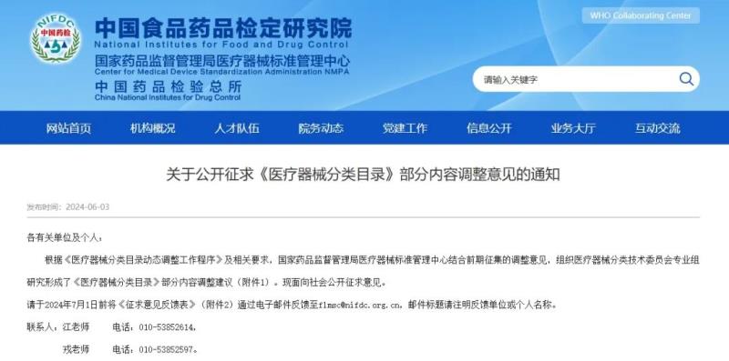 6月3日,國家藥監(jiān)局醫(yī)療器械標(biāo)管中心發(fā)布《關(guān)于公開征求〈醫(yī)療器械分類目錄〉部分內(nèi)容調(diào)整意見的通知》,并向社會公開征求意見。