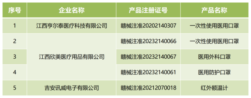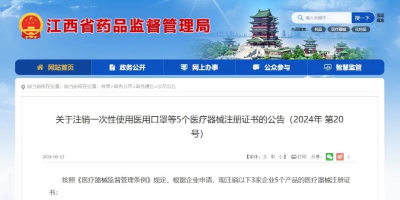 6月13日,江西省藥監(jiān)局發(fā)布一則注銷公告,其中提到,按照《醫(yī)療器械監(jiān)督管理條例》規(guī)定,根據(jù)企業(yè)申請,注銷江西欣美醫(yī)療用品有限公司等3家企業(yè)5個產(chǎn)品(主要為醫(yī)用口罩及紅外額溫計)的醫(yī)療器械注冊證書,具體明細如下: