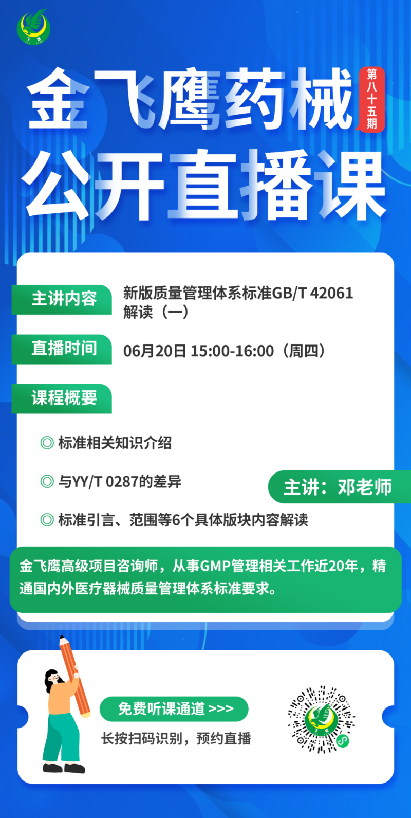 6月20日下午3點(diǎn),金飛鷹高級(jí)項(xiàng)目咨詢師,從事GMP管理相關(guān)工作近20年,精通國內(nèi)外醫(yī)療器械質(zhì)量管理體系標(biāo)準(zhǔn)要求的鄧?yán)蠋?/span>,給大家?guī)怼缎掳驷t(yī)療器械質(zhì)量管理體系標(biāo)準(zhǔn)GB/T 42061解讀(一)》,培訓(xùn)內(nèi)容包括標(biāo)準(zhǔn)相關(guān)知識(shí)介紹、與YY/T 0287的差異、標(biāo)準(zhǔn)引言/范圍等6個(gè)具體版塊內(nèi)容解讀,醫(yī)療器械經(jīng)營企業(yè)千萬不要錯(cuò)過了哦!