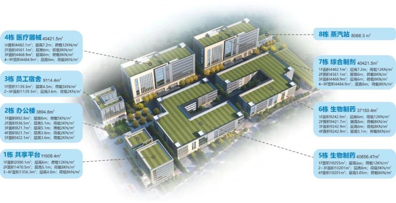 三醫(yī)智造中心一期為工業(yè)載體,總占地123畝,總建筑面積25萬(wàn)㎡,其中產(chǎn)業(yè)建筑面積18.3萬(wàn)㎡,建設(shè)高承重、高層高標(biāo)準(zhǔn)廠房,配置雙回路供電、蒸汽站、污水處理站、?;瘞?kù)、倒班房等設(shè)施。層高4.8-7.2m,承重0.8-1.2噸,面積單層最大可達(dá)1萬(wàn)㎡。主要引入綜合制劑、生物技術(shù)藥、醫(yī)療器械、細(xì)胞治療、綠色食品、電子信息等項(xiàng)目的中試與生產(chǎn)。