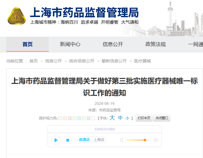 上海市藥品監(jiān)督管理局 - 2024年6月19日,發(fā)布通知提醒第三批UDI實施工作即將正式執(zhí)行-《上海市藥品監(jiān)督管理局關于做好第三批實施醫(yī)療器械唯一標識工作的通知》
