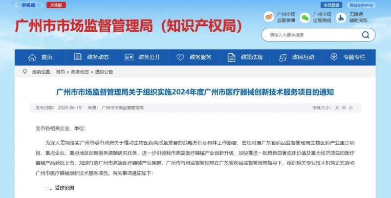 6月19日,廣州市市場監(jiān)督管理局發(fā)布《關(guān)于組織實施2024年度廣州市醫(yī)療器械創(chuàng)新技術(shù)服務(wù)項目的通知》(以下簡稱《通知》),《通知》指出,該局已組織相關(guān)專業(yè)技術(shù)機(jī)構(gòu)正式啟動廣州市醫(yī)療器械創(chuàng)新技術(shù)服務(wù)項目。具體事項如下: